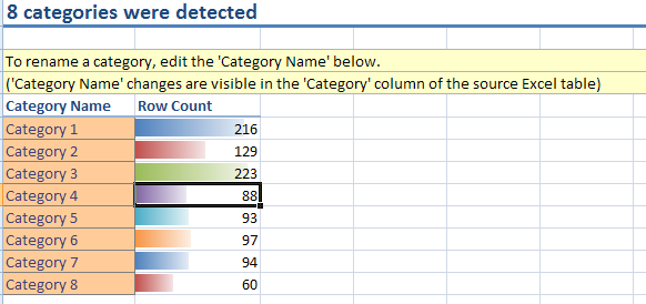 As in the previous case, you can use the Table Analysis Tools Sample Excel sheet. After selecting the table in the sheet, select Detect Categories from the Analyze table which will bring up following dialog box: